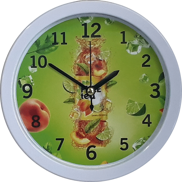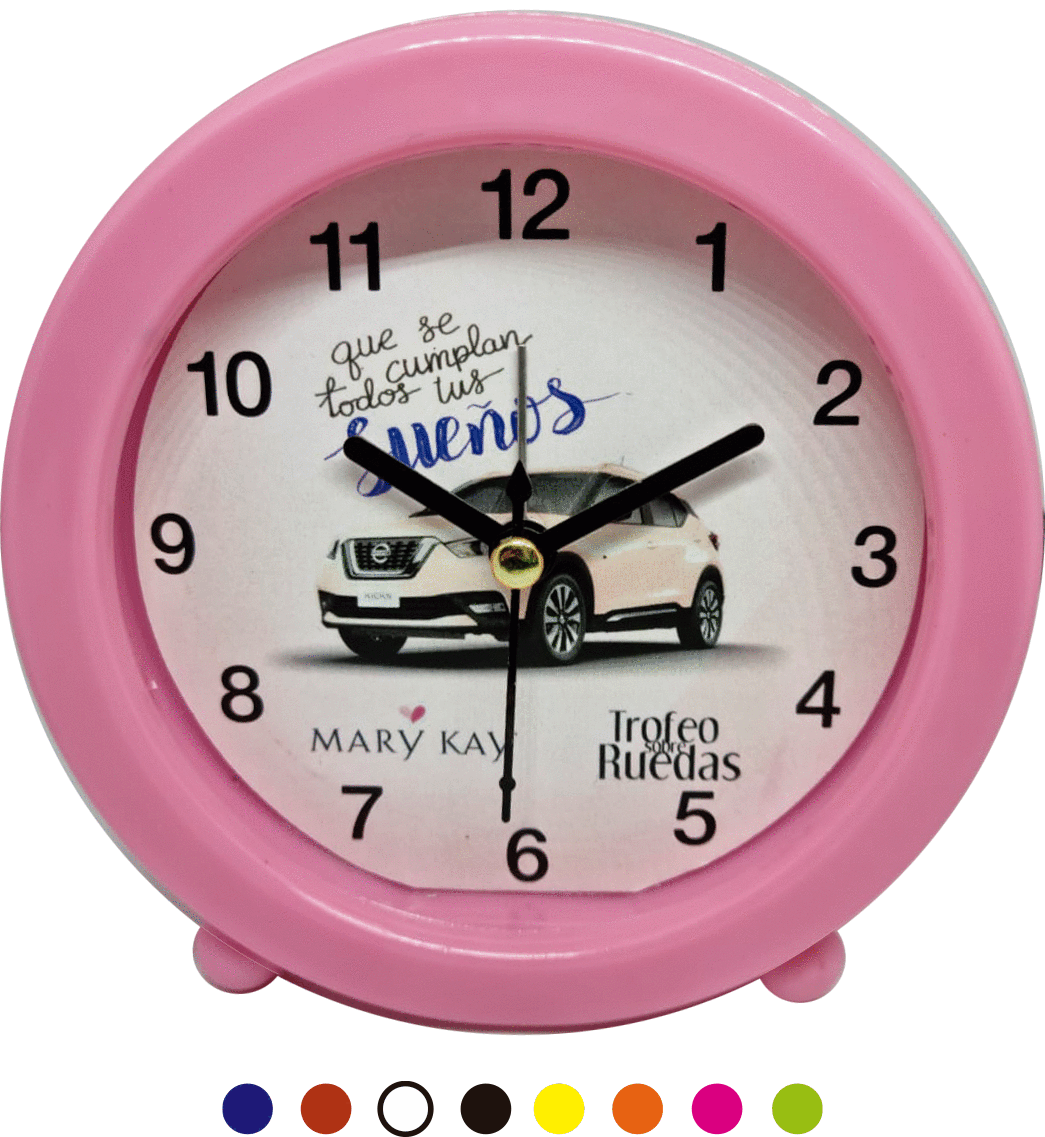 Descripción: Reloj despertador redondo, diámetro de 10.5 cm, base de plástico y protección de vidrio